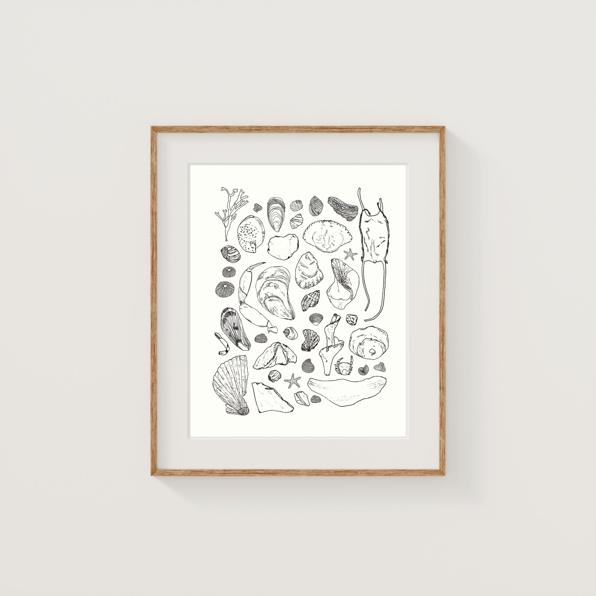 Fine art print of a collection of seashells and sea creatures, originally created with ink. Inspired by beachcombing along the shores of Cape Cod.