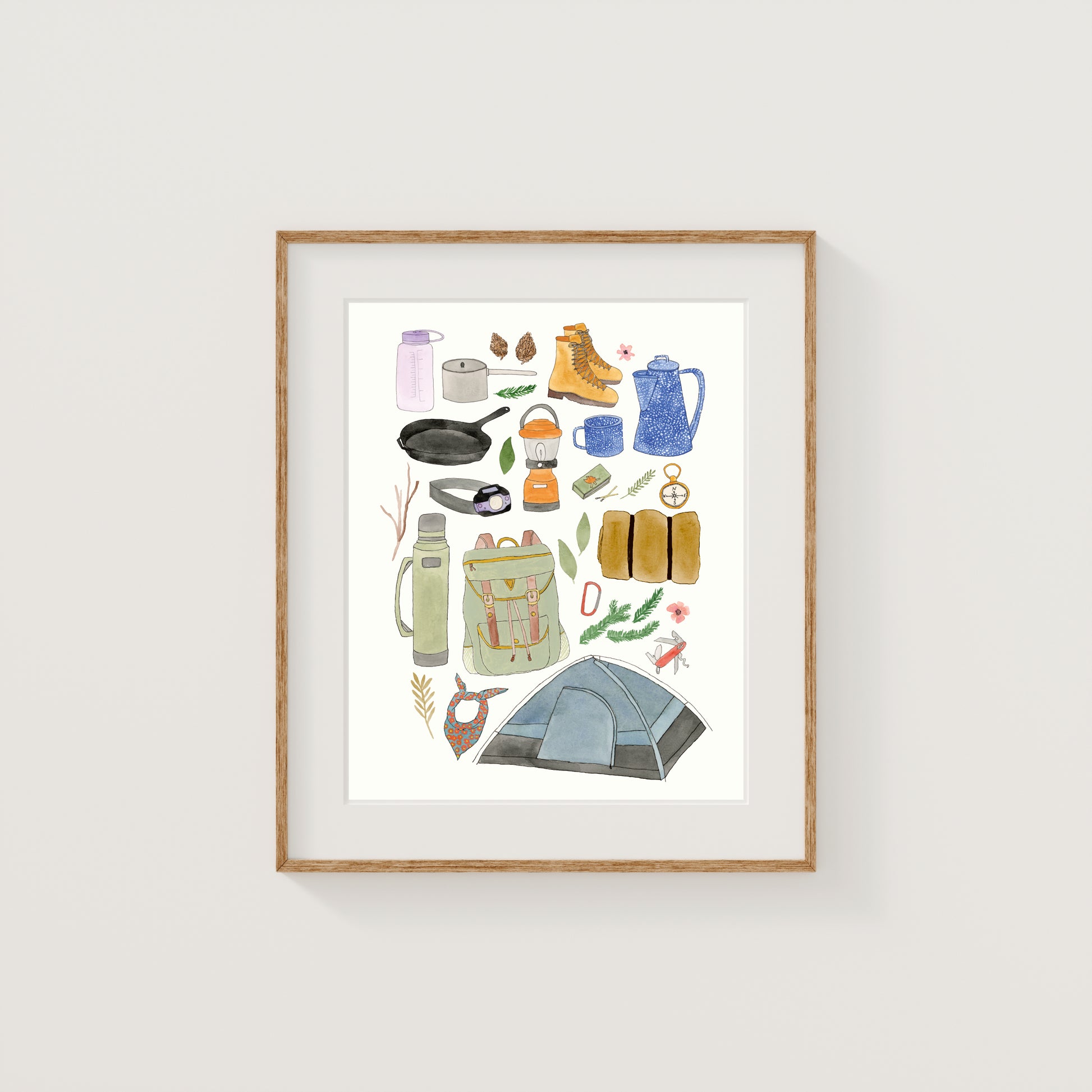 Camping Supplies Collection Art Print | Watercolor and Ink