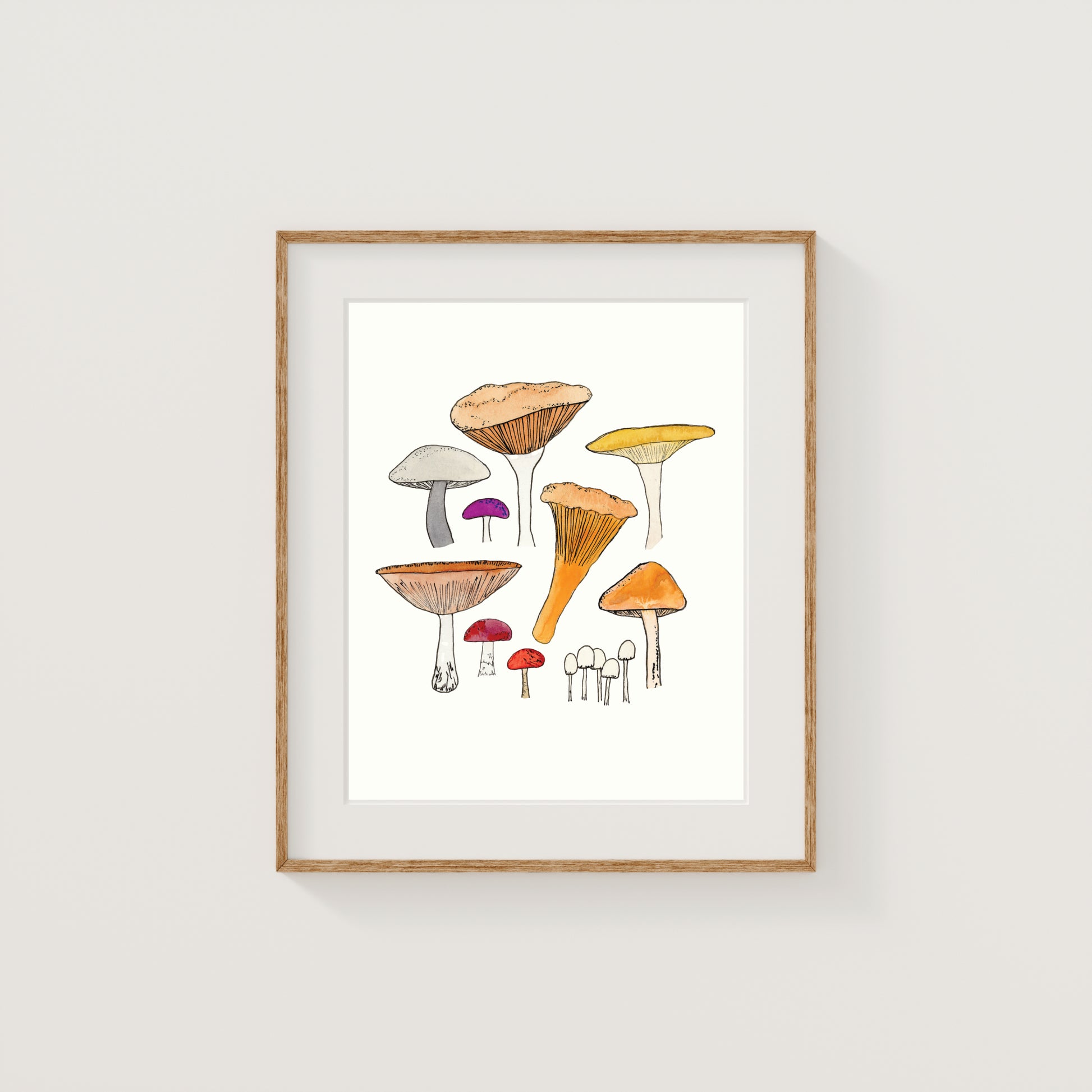 Fine art print of a collection of colorful mushrooms, originally created with watercolor and ink.
