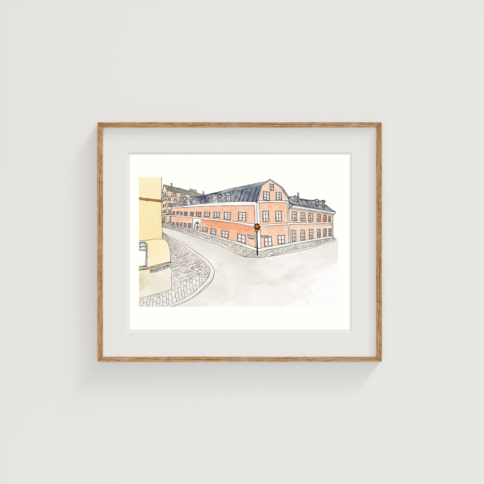 Fine art print of a Copenhagen street, originally created with watercolor and ink.