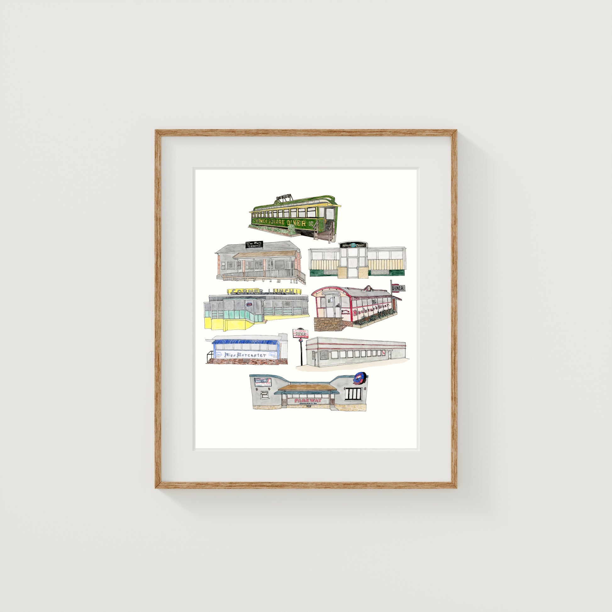 Fine art print of a collection of Worcester diners, originally created with watercolor and ink.