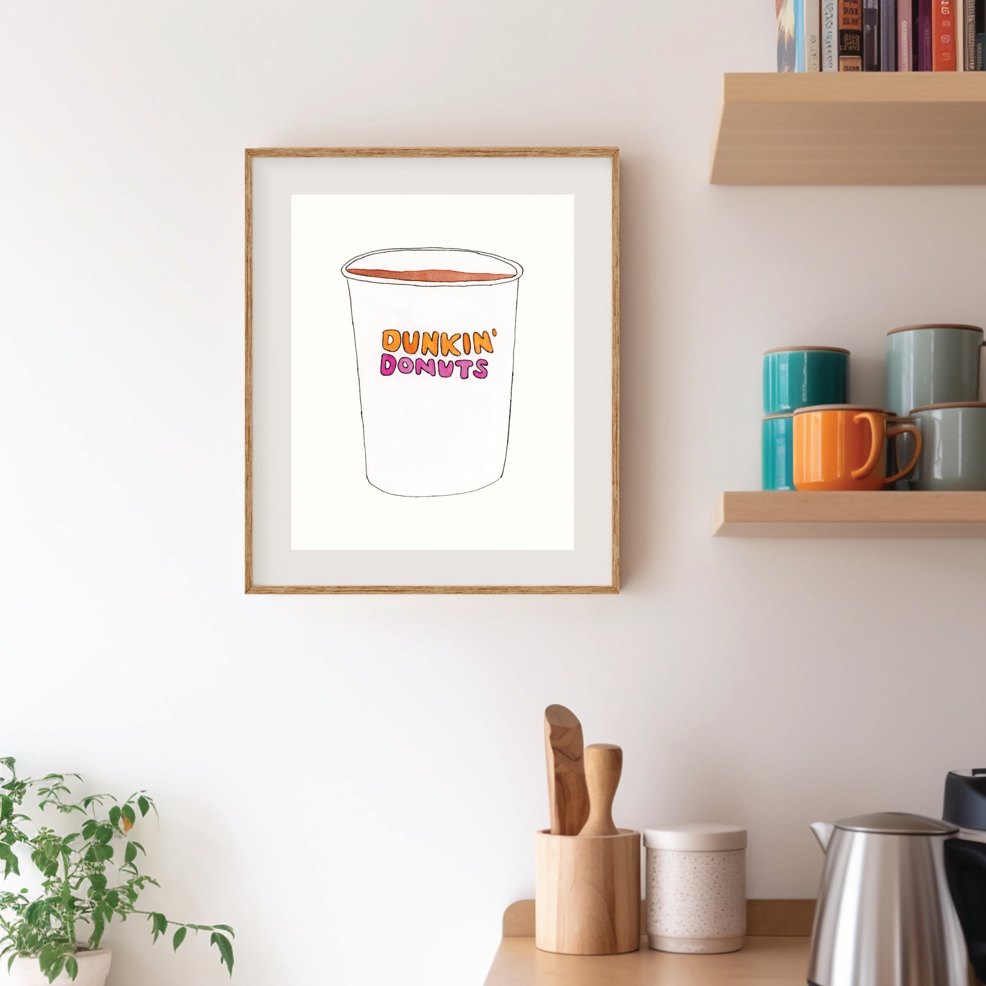 Fine art print of a cup of Dunkin' Donuts coffee, originally created with watercolor and ink.