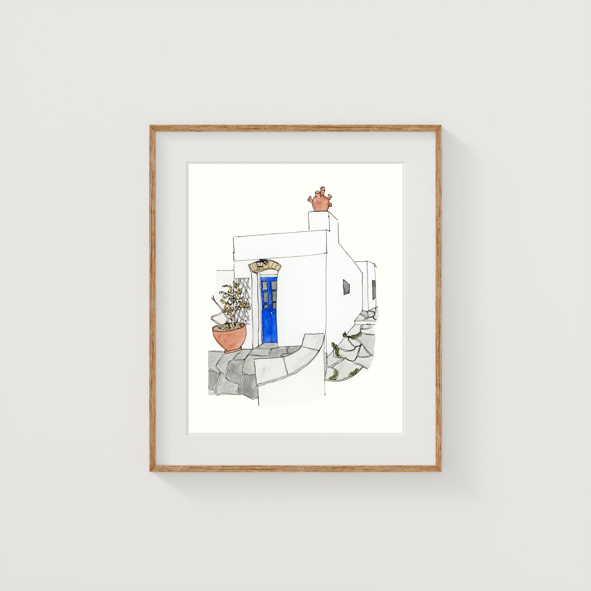 Fine art print of a house in Greece, originally created with watercolor and ink.