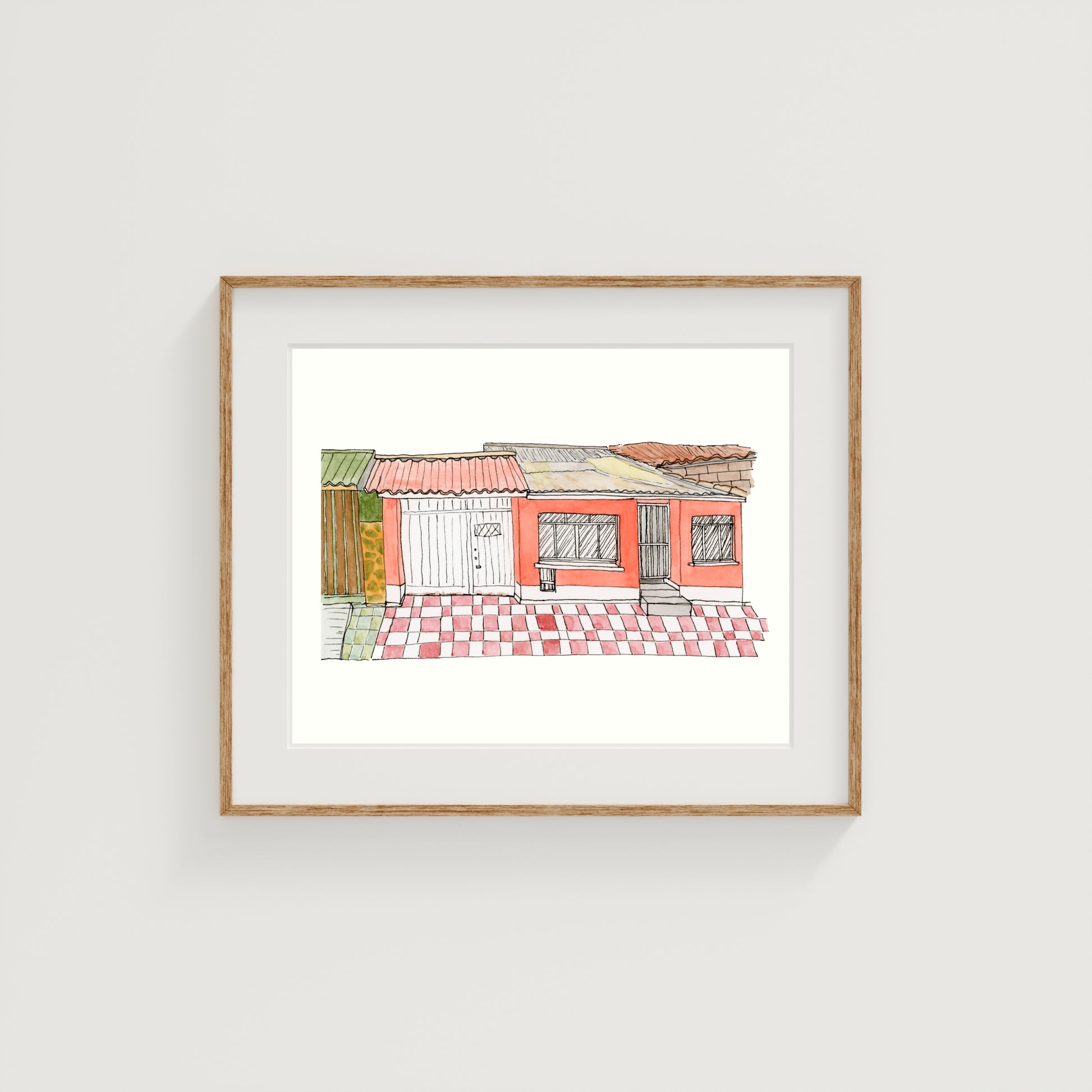 Fine art print of buildings in Guatemala, originally created with watercolor and ink.