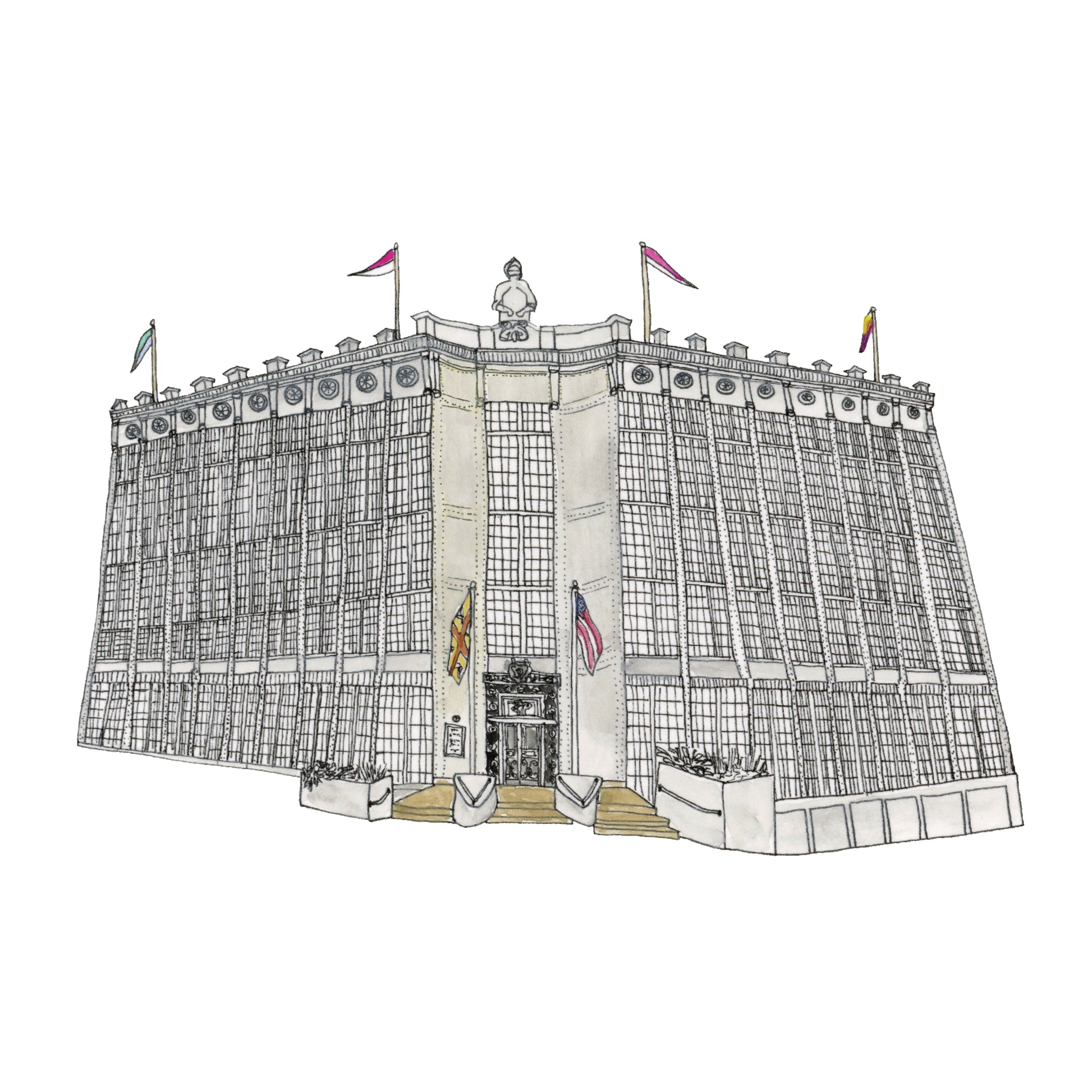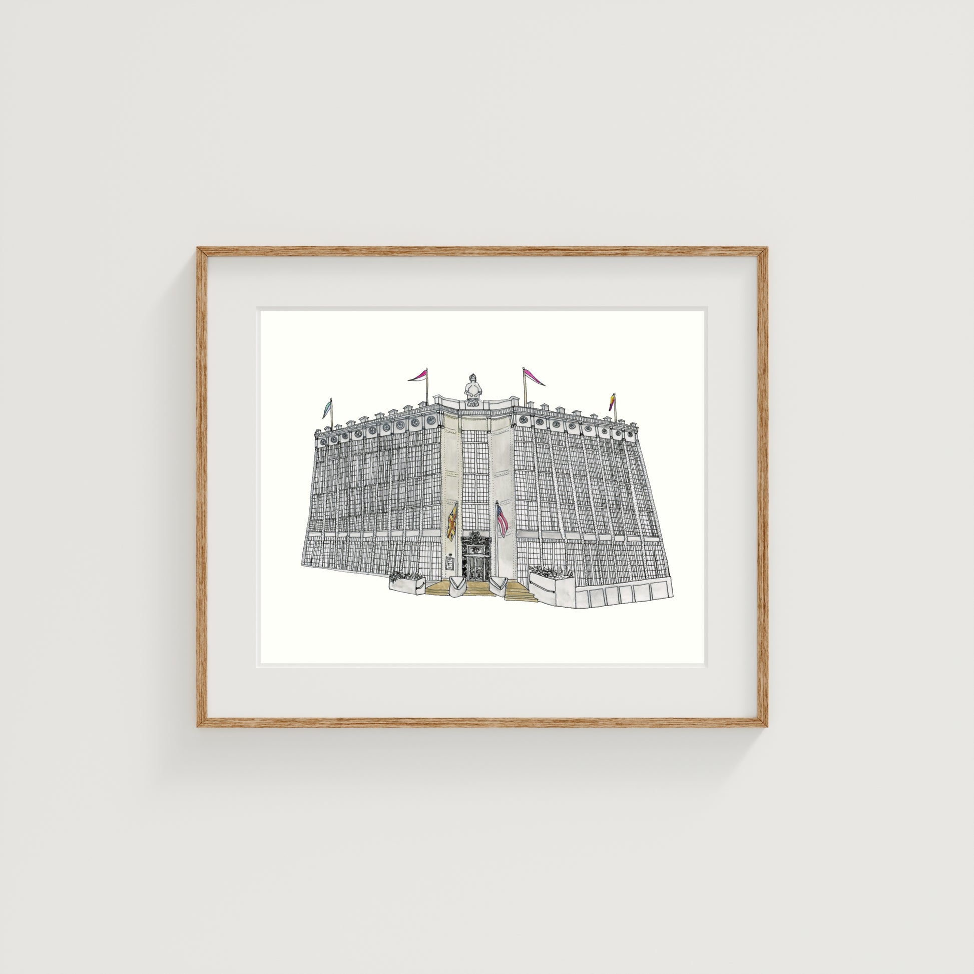 Fine art print of Higgins Armory in Worcester, MA, originally created with watercolor and ink.