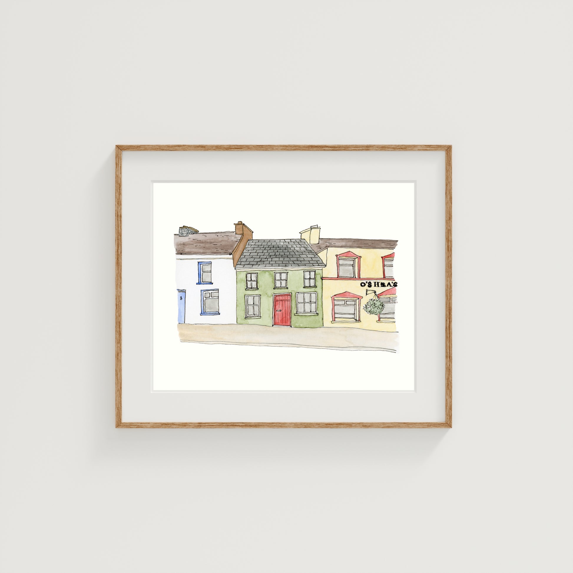 Fine art print of buildings in Ireland, originally created with watercolor and ink.