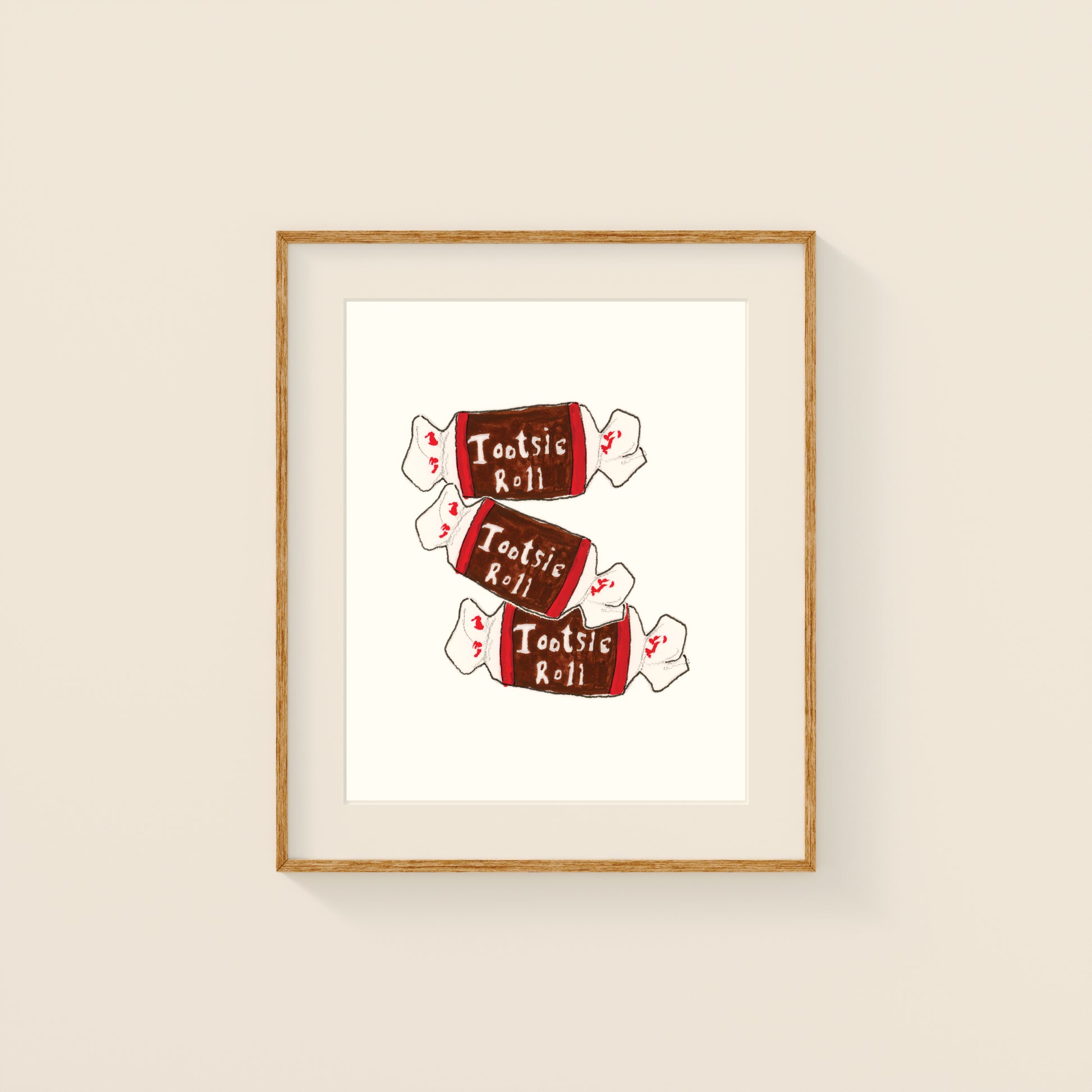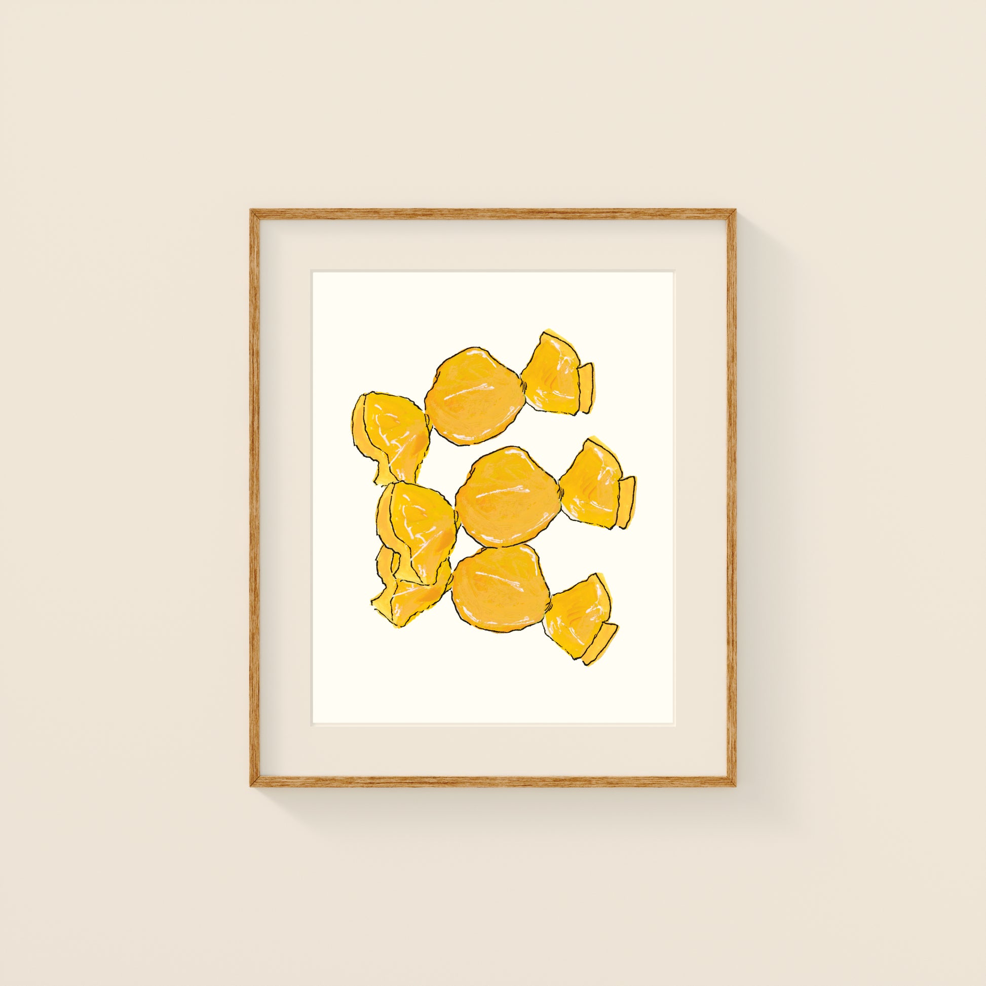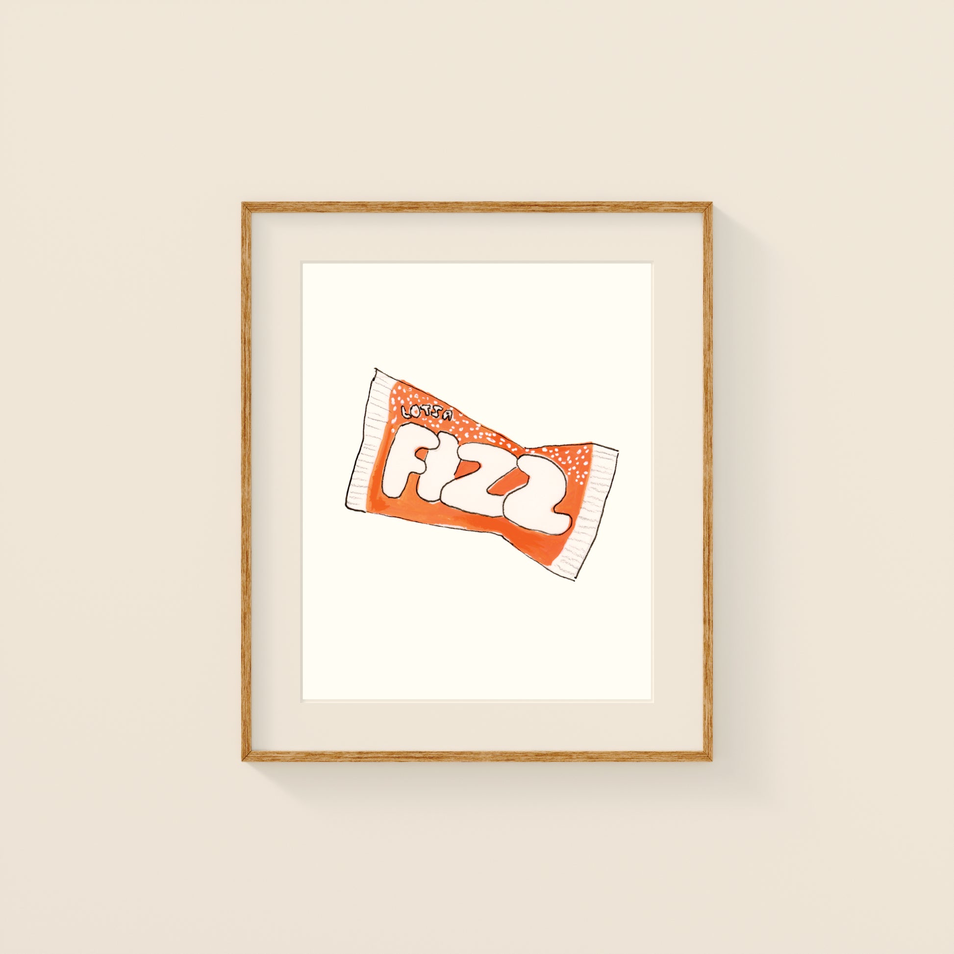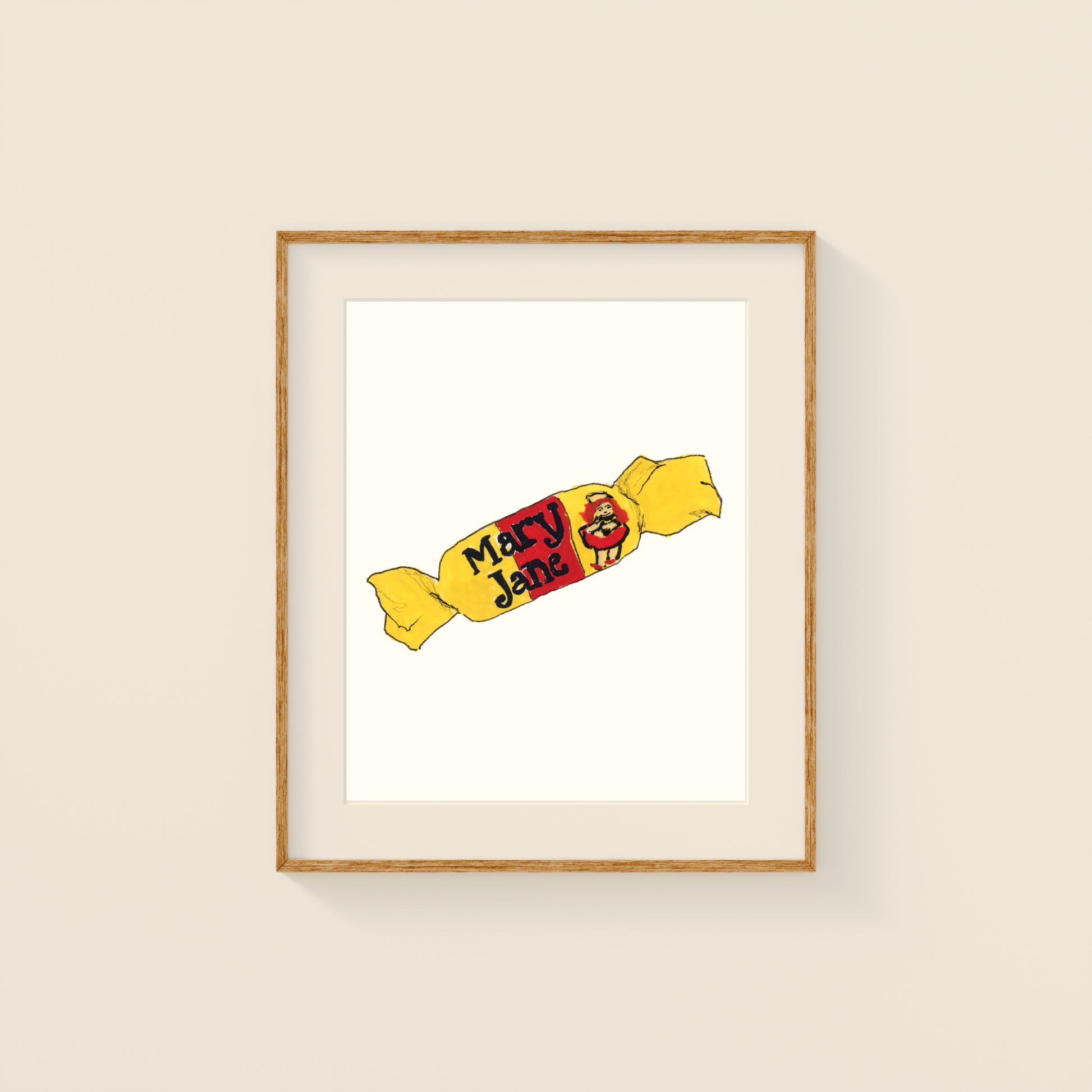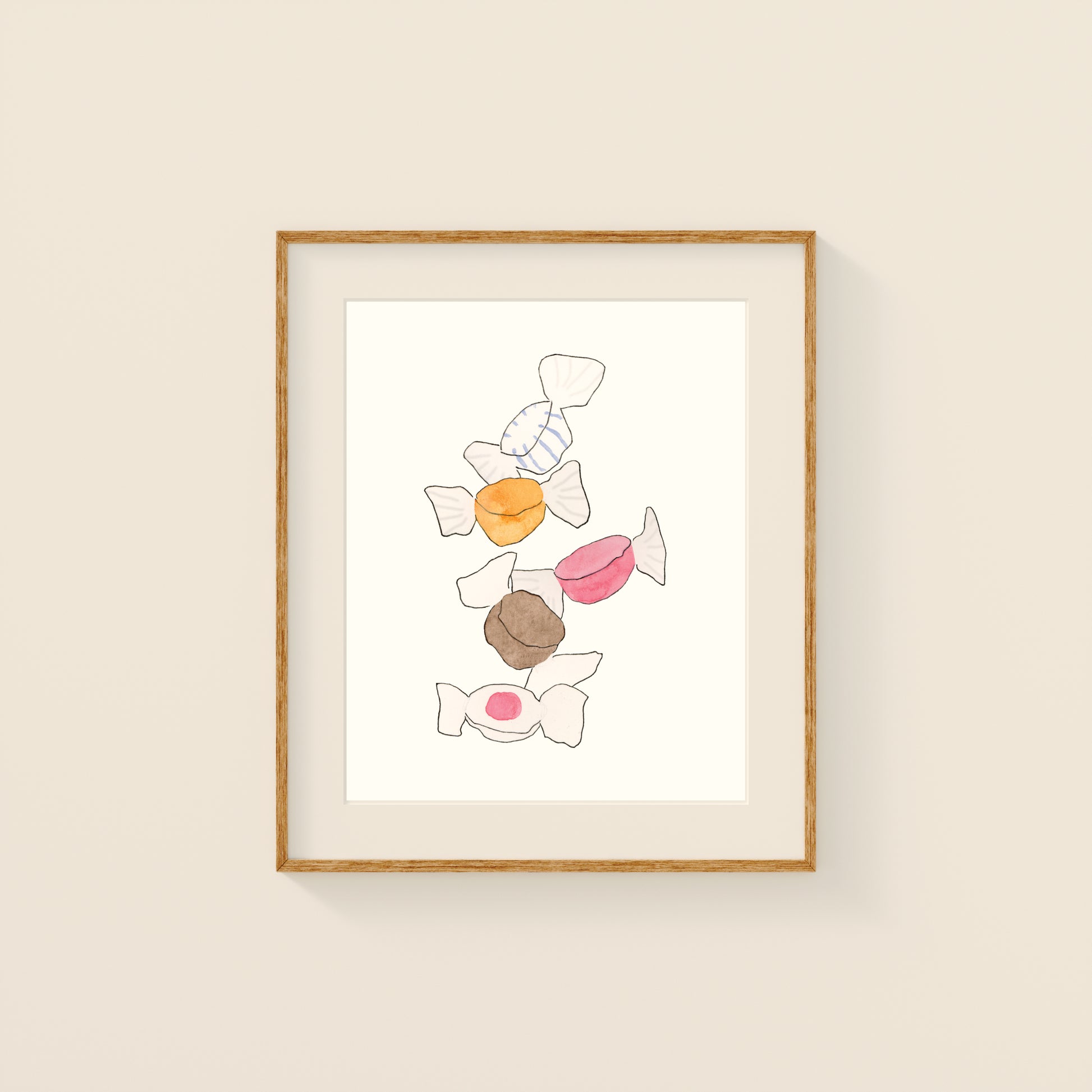 Mini art p rints of individual illustrations from my retro candy print! Each print measures approximately 4"x5". You can add on a white mat board so that your print is ready to pop into a 5"x7" frame (example shown in first photo).