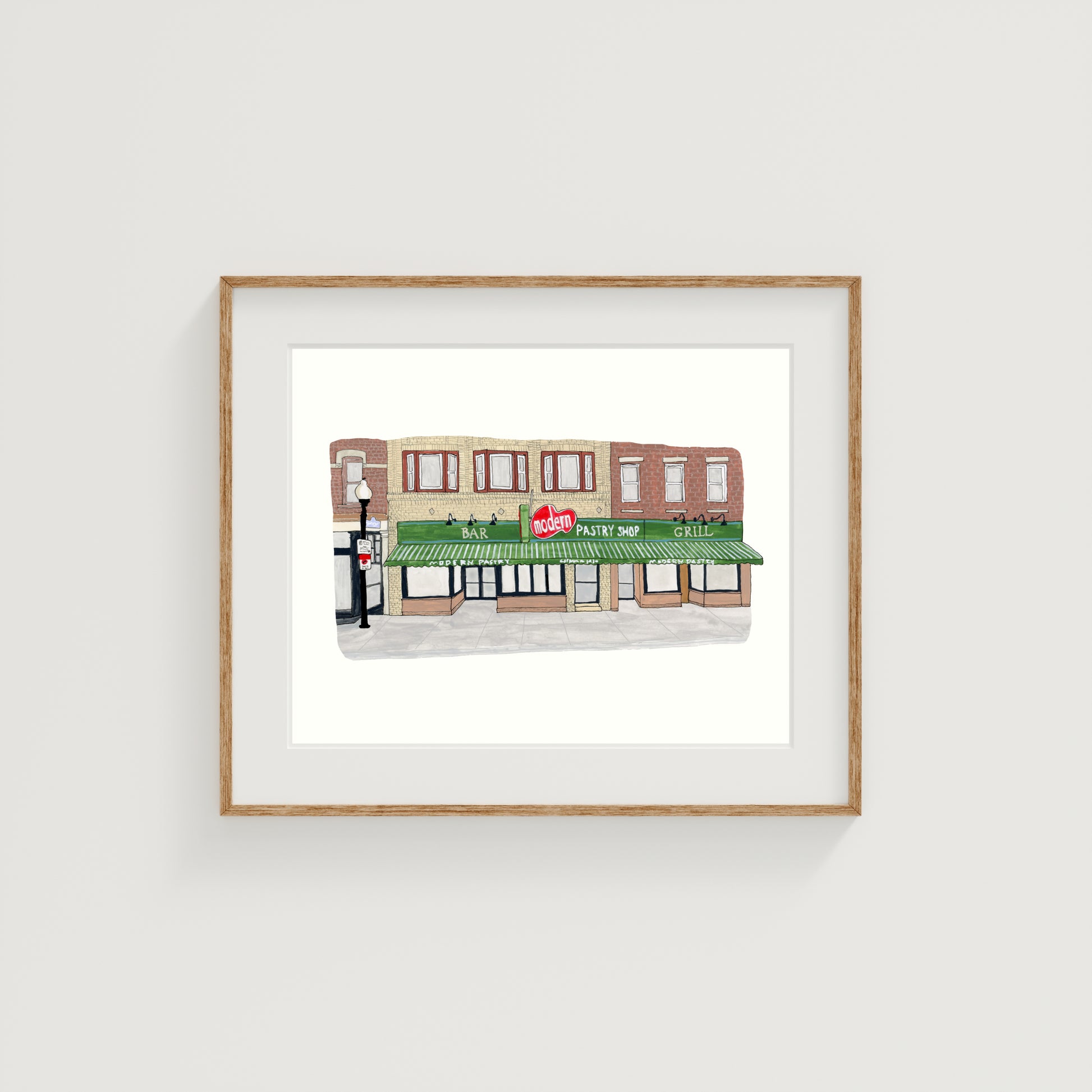 Fine art print of Modern Pastry in Boston's North End, originally created with gouache and ink.