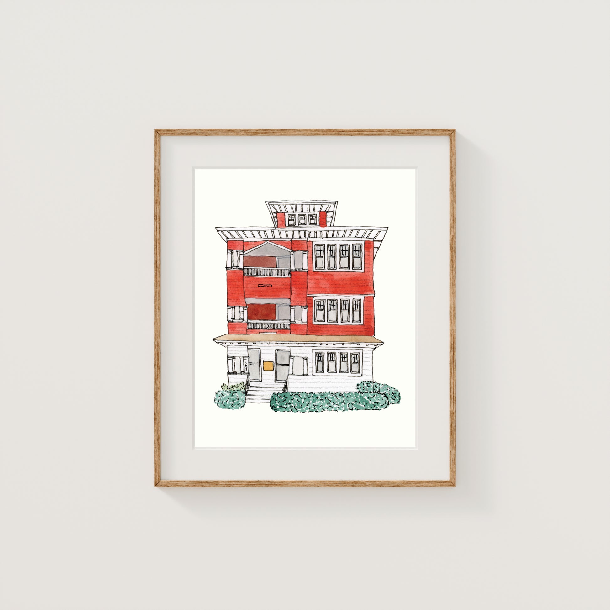 Fine art print of a red triple decker in Worcester, Massachusetts, originally created with watercolor and ink.
