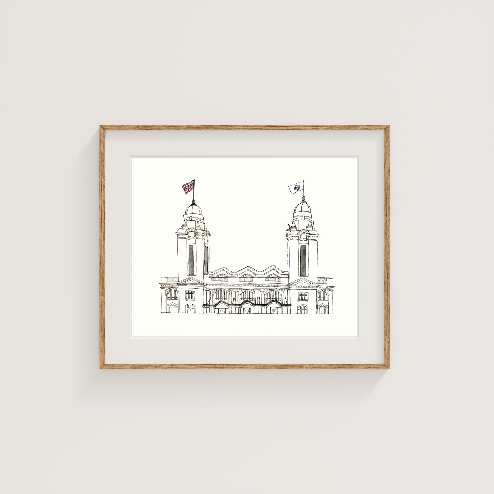 Fine art print of Union Station in Worcester, MA, originally created with watercolor and ink.