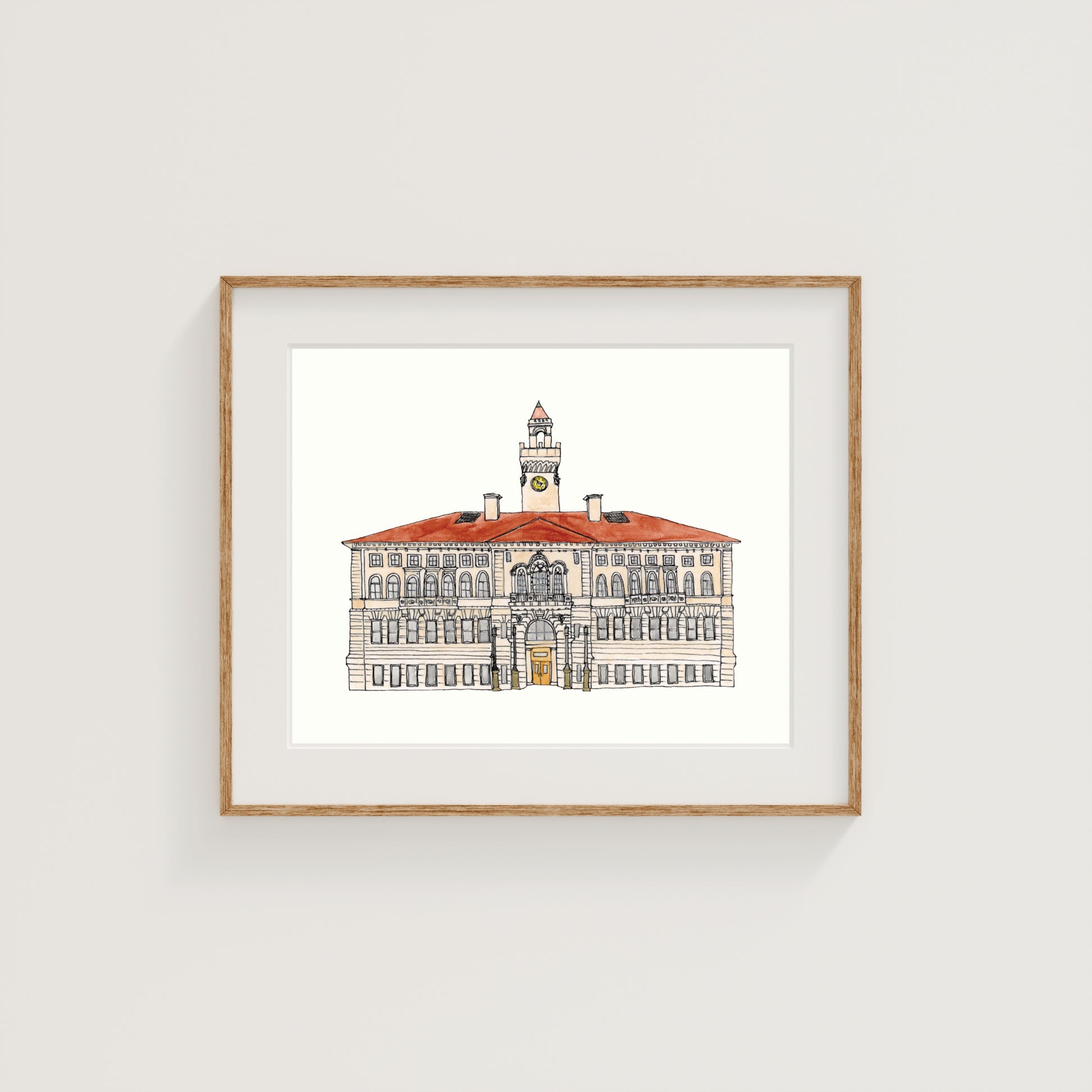 Fine art print of City Hall in Worcester, MA, originally created with watercolor and ink.