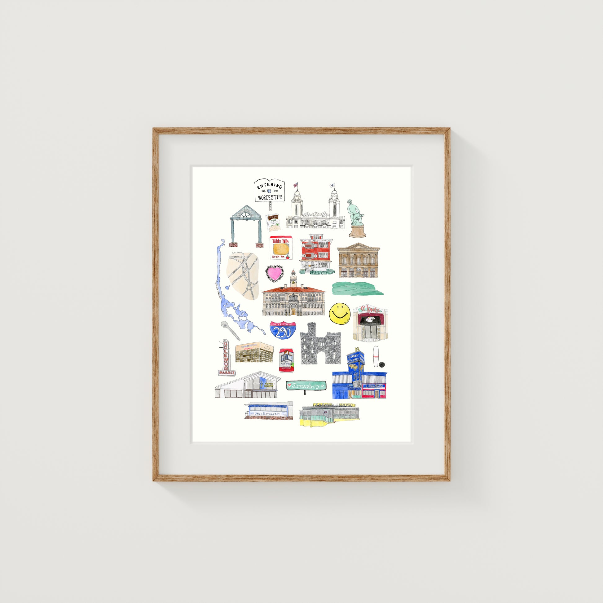 Fine art print of a collection of Worcester favorites, originally created with watercolor and ink.